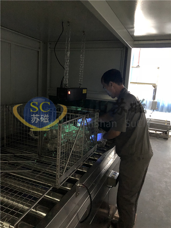 熒光滲透探傷系統對現有簡單的熒光滲透探傷檢測設備結構的改進,包括預清洗部分、滲透部分、后清洗部分和輸送系統,通過將上述各部分的槽體設計呈雙層結構,并具有上蓋和開蓋裝置,相關槽體內分別設置噴淋裝置、回轉裝置、升降裝置、升降式暗罩、噴粉裝置,使整個系統科學合理,根據需要組合,能夠實現零件表面缺陷的自動化或半自動化探傷作業,降低了操作人員的勞動強度,提高了熒光滲透探傷的效率,適用于航空、航天、兵器系統和相關民用工業領域對零部件的探傷檢測。
